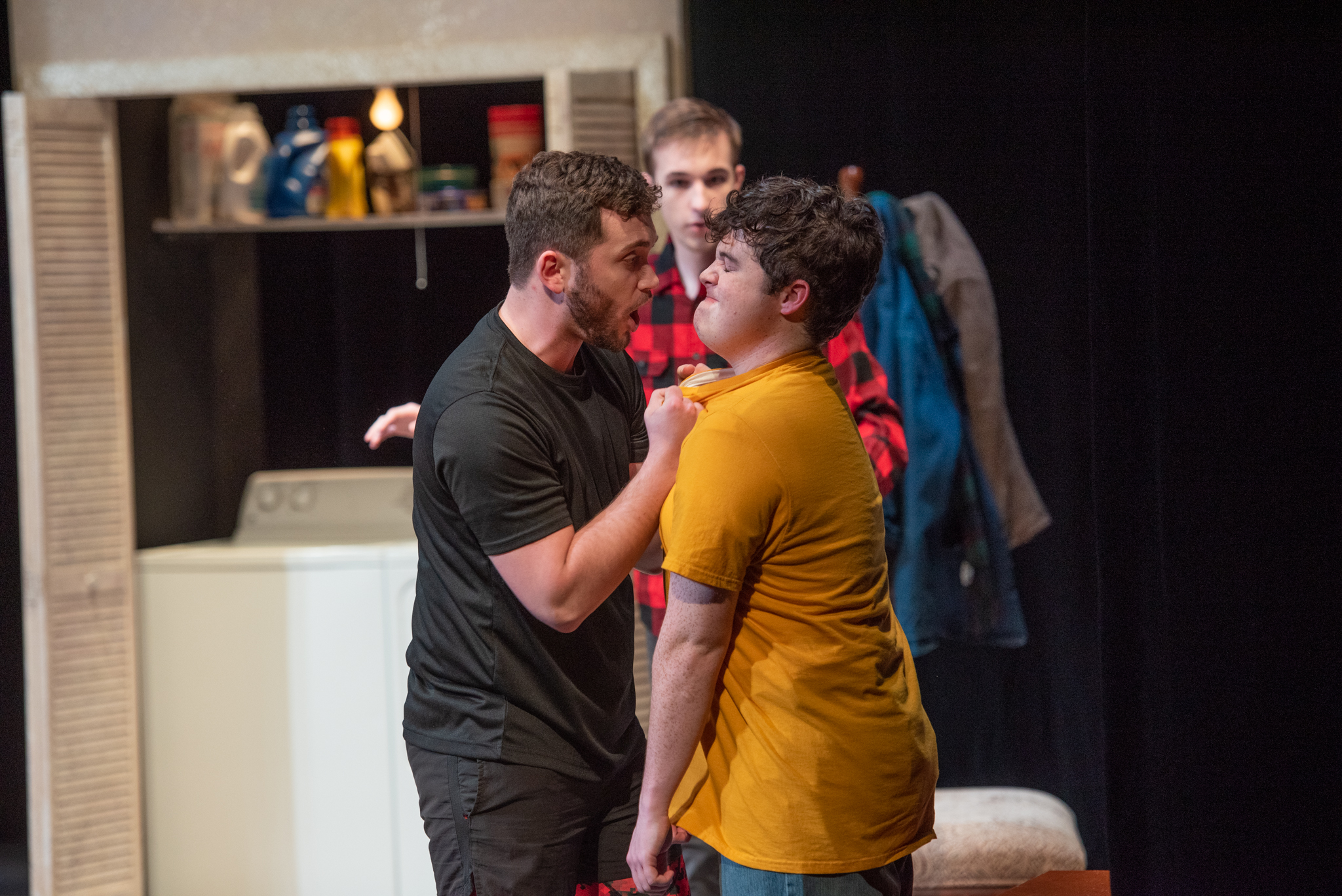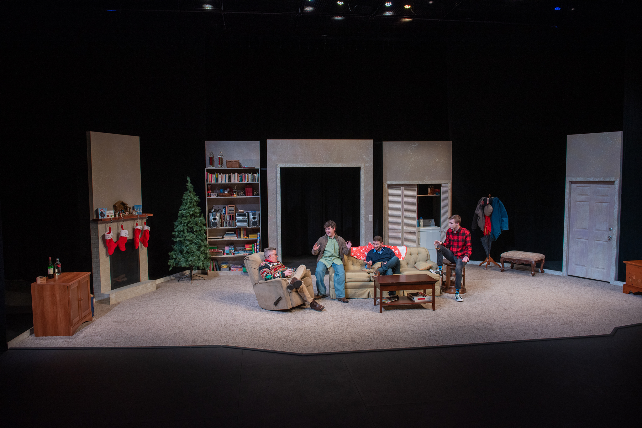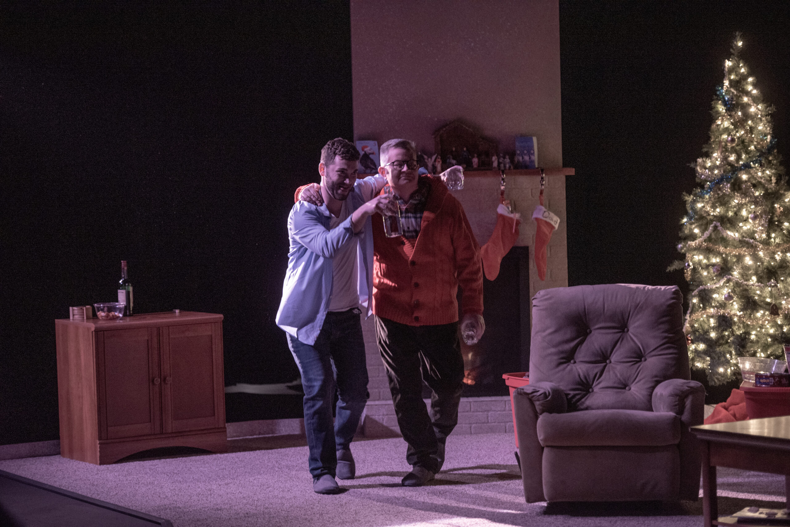 Straight White Men took place in two entirely separate realms of lighting. The preshow instructions call for “Loud, explicit music by female rappers” and the lighting to match. This translated to sweeping moving lights, rotating gobos, and lots of haze.