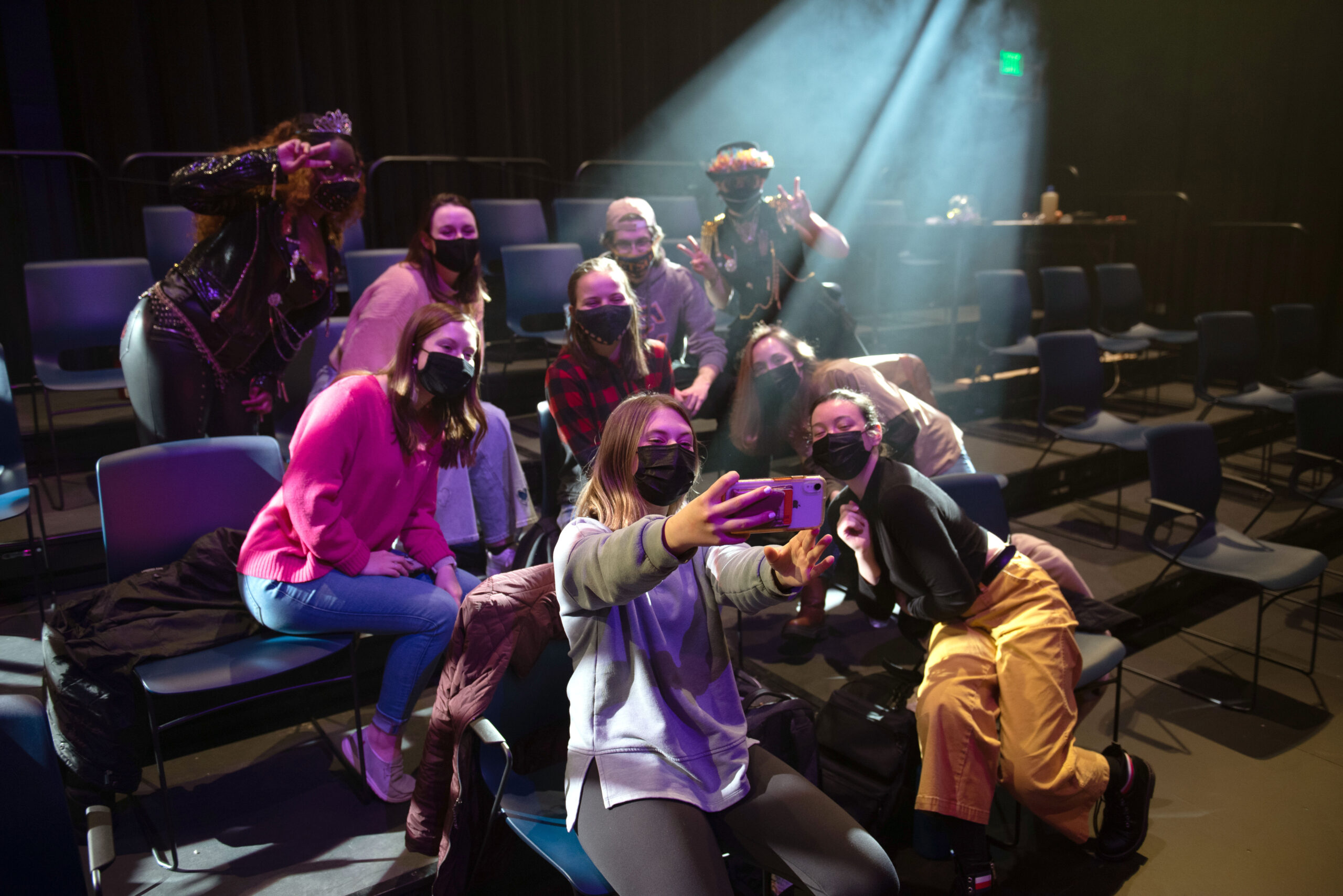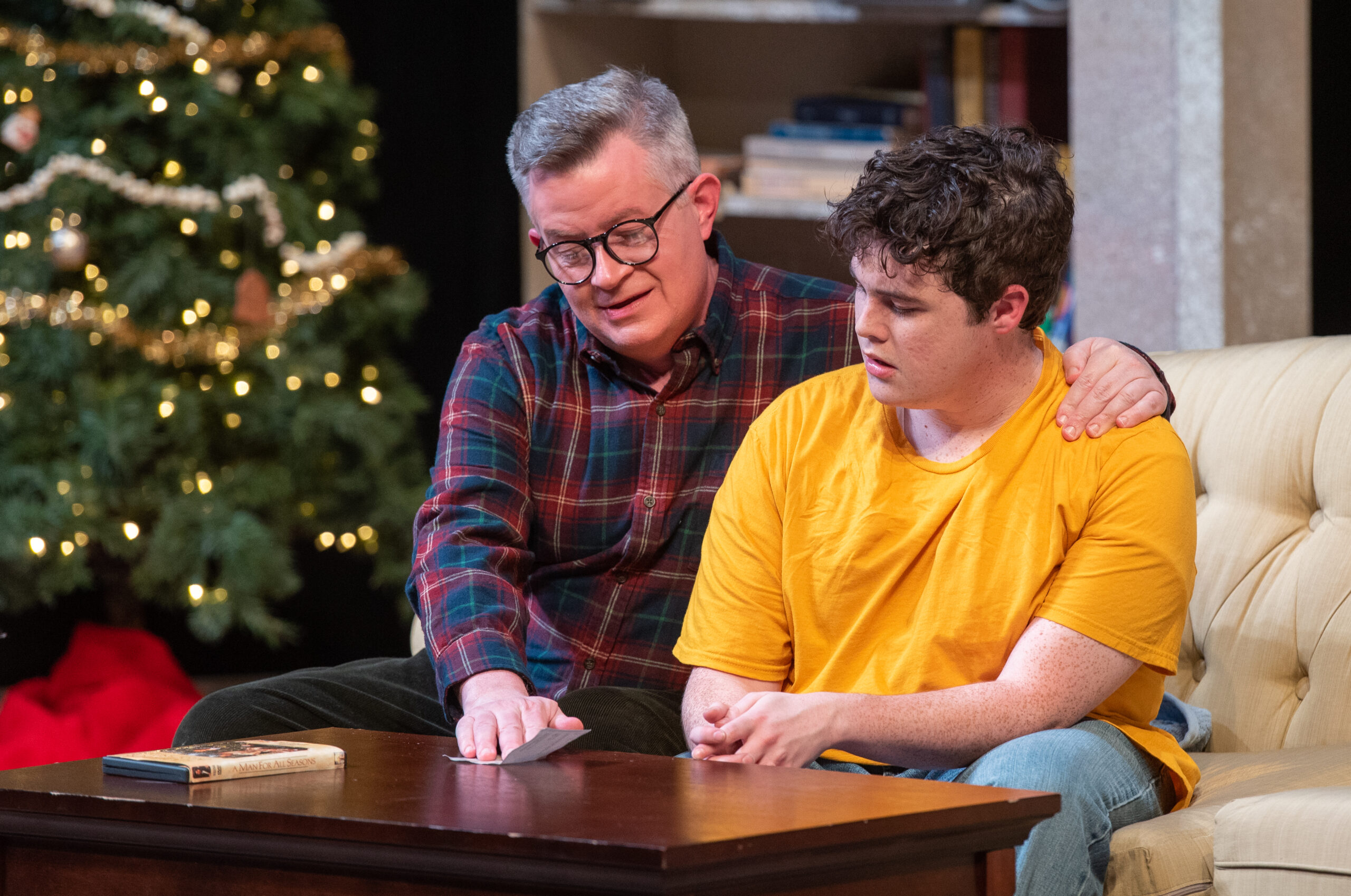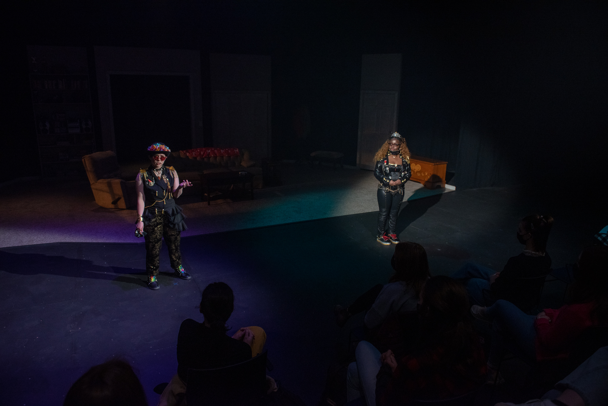 Straight White Men took place in two entirely separate realms of lighting. The preshow instructions call for “Loud, explicit music by female rappers” and the lighting to match. This translated to sweeping moving lights, rotating gobos, and lots of haze.
